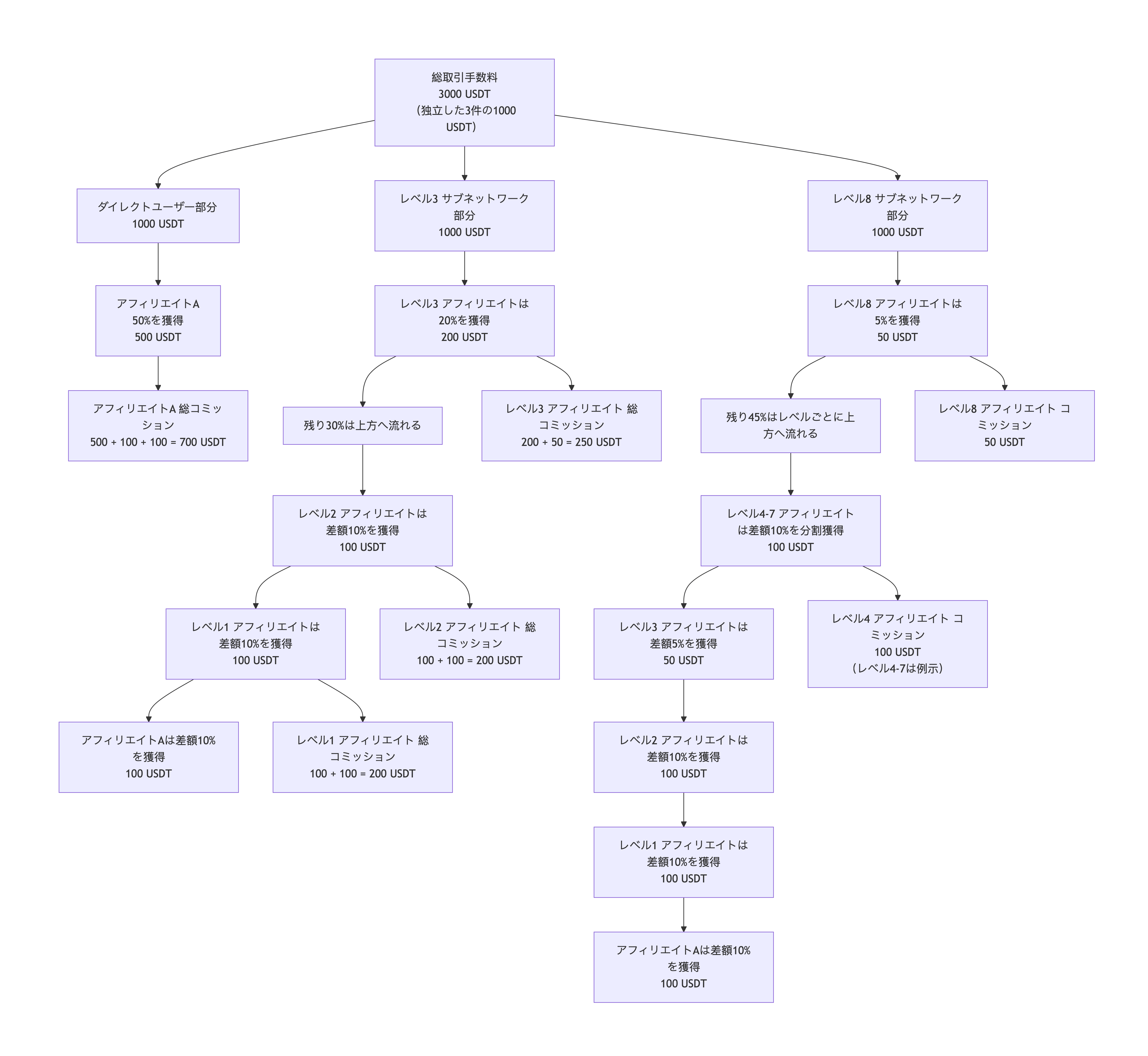 ネットワーク効果の価値:最下層のレベル8アフィリエイトが生み出した取引であっても、最上位にいるあなたは(階層ごとの差額を通じて)コミッションを得ることができます。これはネットワークの深度を拡大する強いインセンティブとなります。