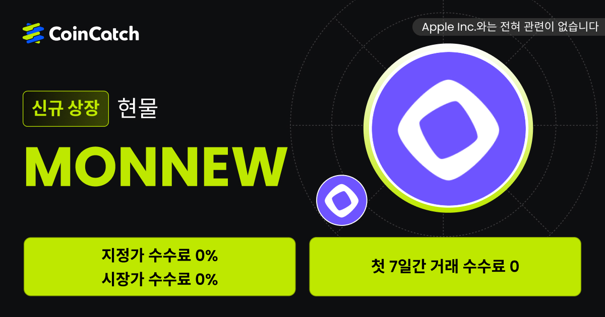 Monad (MONNEW) 코인의 출시를 기념하여, 모든 사용자 대상 수수료 제로 이벤트를 진행합니다. 어디서든 MONNEW 를 거래할 수 있지만, 오직 CoinCatch에서 이벤트 기간 동안 수수료 없이 즐길 수 있습니다! 이 기념적인 순간을 CoinCatch와 함께하여 암호화폐의 새로운 시대를 시작해 보세요!