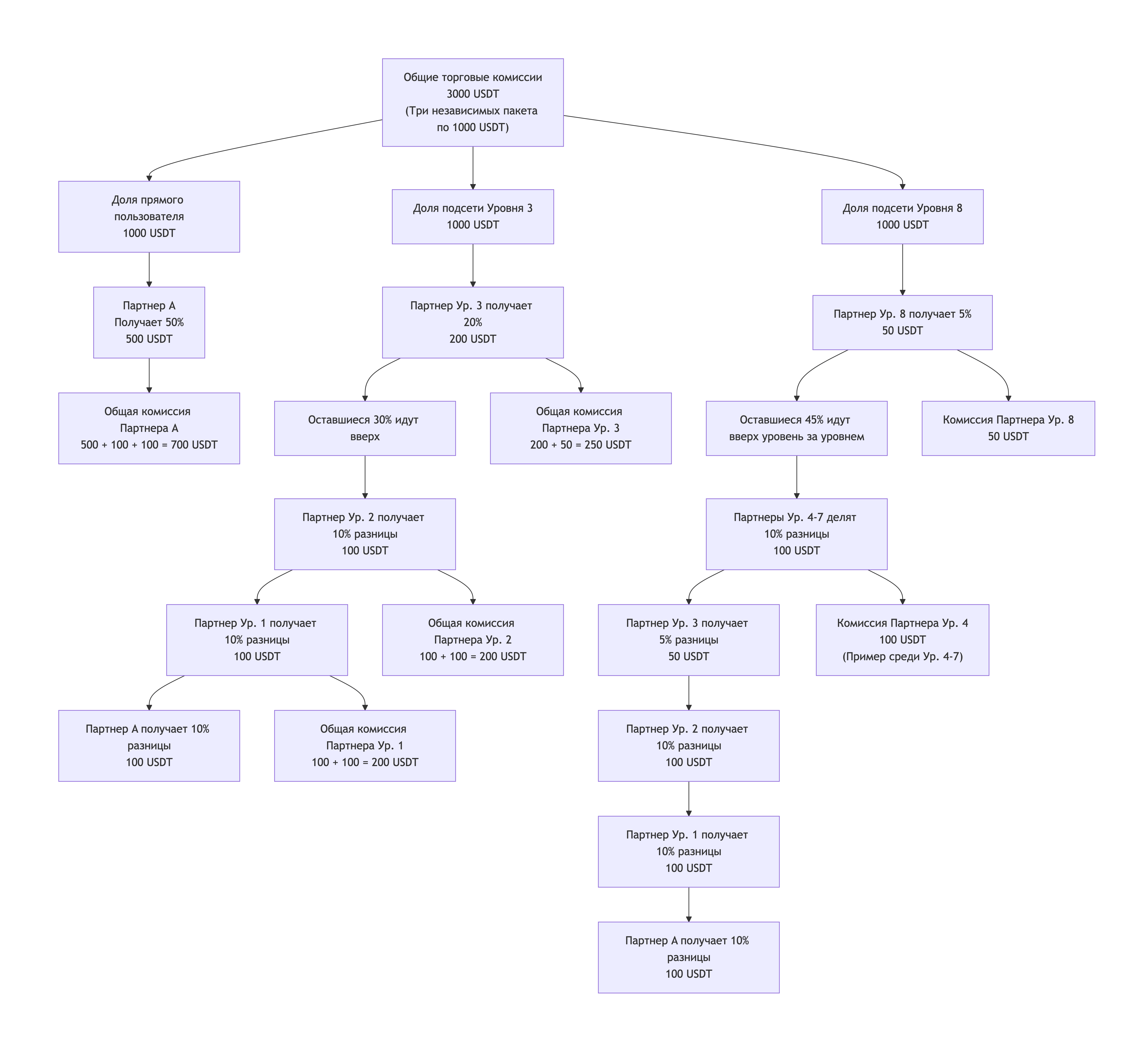 Субпартнер Уровня 8: Получает от своего вышестоящего (Уровень 7) выделенную ставку 5% Как распределяется комиссия, когда субпартнеры Уровня 8, Уровня 3 и ваш прямой пользователь каждый независимо генерируют 1000 USDT торговых комиссий? Приведенная ниже диаграмма наглядно иллюстрирует конкретный поток и окончательное распределение этих общих 3000 USDT комиссий в партнерской сети. Ключевые выводы: